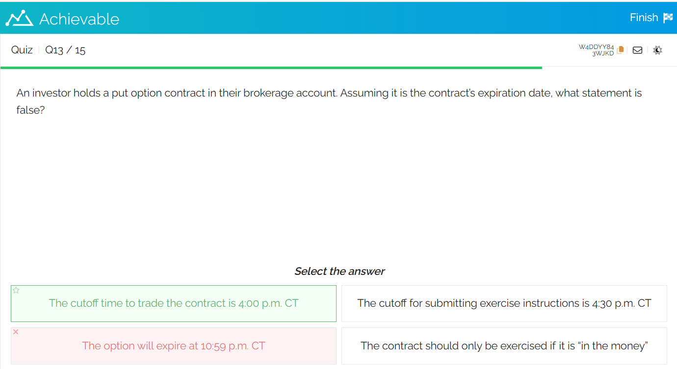 I am currently on the options chapter and wanted to flag that this questions correct answer is incorrect. The time zone was wrong for option trade cutoff time being 4:00pm CT. The answer is actually 3:00pm CT/4:00pm ET. I chose the wrong answer because they all looked incorrect. Can I get clarification on this?